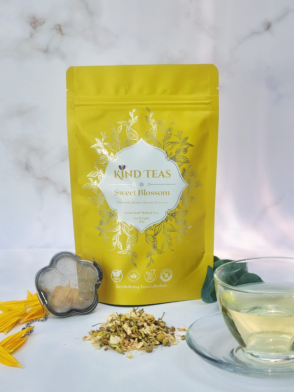 Unwind with this soothing herbal blend of calming Chamomile, fragrant Jasmine, and naturally sweet Licorice. Delicate, floral, and gently comforting, perfect for moments of peace, day or night.